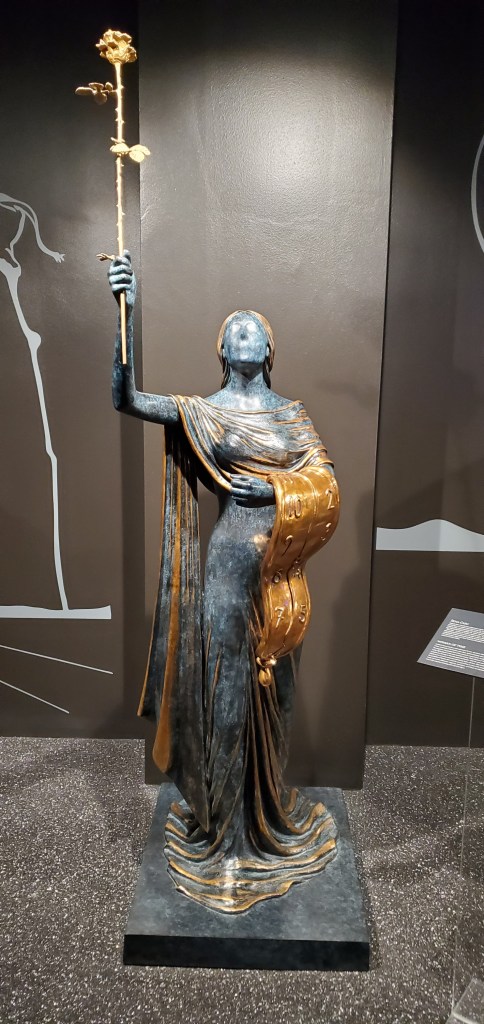 The statue is expressionless, and thus, so am I. The exhibit itself is dark and mysterious. All of the fixtures of this exhibit are in black, the bright lights serve to illuminate the shapes and colors of the world’s most famous surrealist.