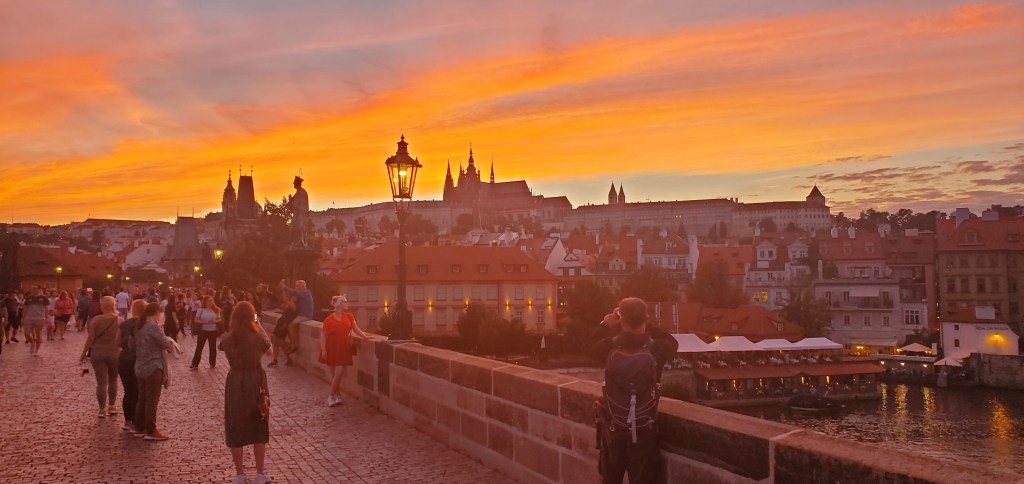 The sun sets over Petřín Hill, illuminating Prague Castle and the Charles Bridge. And as another American in Europe reminded us, the sun also rises . . . Until next time . . .
