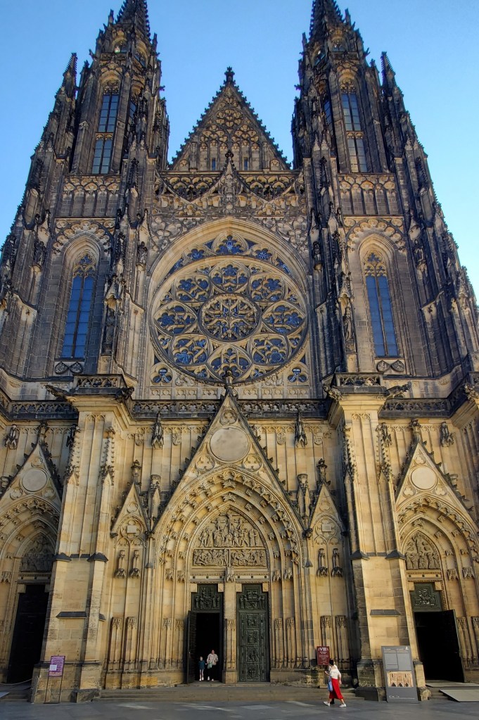 St. Vitus Cathedral dwarfs its puny human visitors Prague castle is situated just below the crest of a hill and overlooks the historic neighborhoods of Staré Město and Malá Straná. Conversely, those in the aforementioned neighborhoods on the banks of the Vltava River stare up in awe of the castle that perpetually gazes down upon them. I arrived early in the morning–so early that the ticket office wasn’t even open yet. It was 8:45 AM, and the hordes of tourists had yet to clog castle complex. The castle grounds are open to the public at 6, while the historical buildings don’t open until 9. And although the grounds of Prague Castle are free, its most prominent attractions–such as the cathedral and the bell tower–require a ticket prior to entry. I enjoyed a few luxurious moments of near-solitude as I casually strolled across the castle’s main square, and as soon as the ticket office opened, I made like a bee line to the front desk to purchase my ticket.