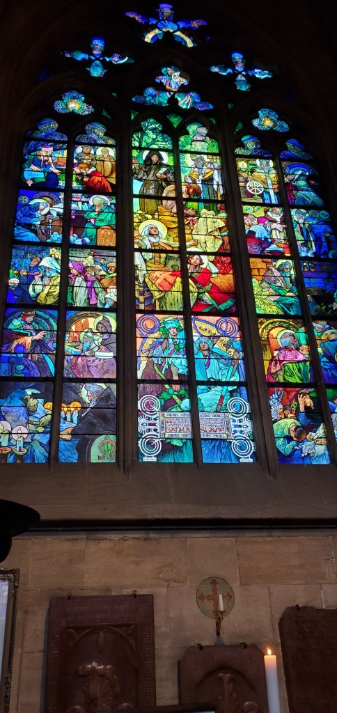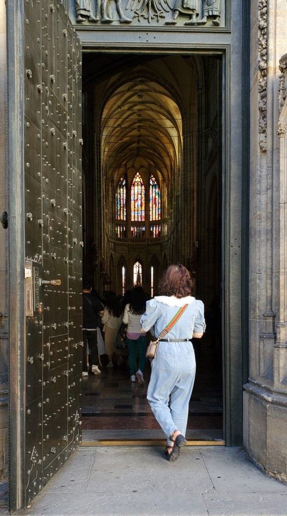 A guided tour group enters the historic St. Vitus Cathedral Once inside, the morning sunlight illuminates the stained glass windows within. Perhaps the hunchback of Notre Dame could have visited this Cathedral, as its splendid artwork forces one to look up and admire its sheer beauty. If you’ve got bad posture, St. Vitus Cathedral is a must visit.