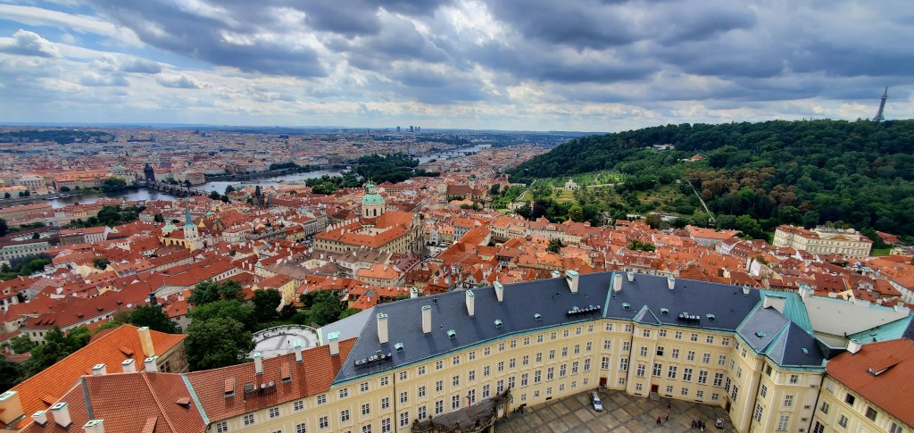 A birds eye view from the top of the Great South Tower. On the left is Charles Bridge. Just beyond the castle walls is Malá Straná. On the right, Petrin Tower.