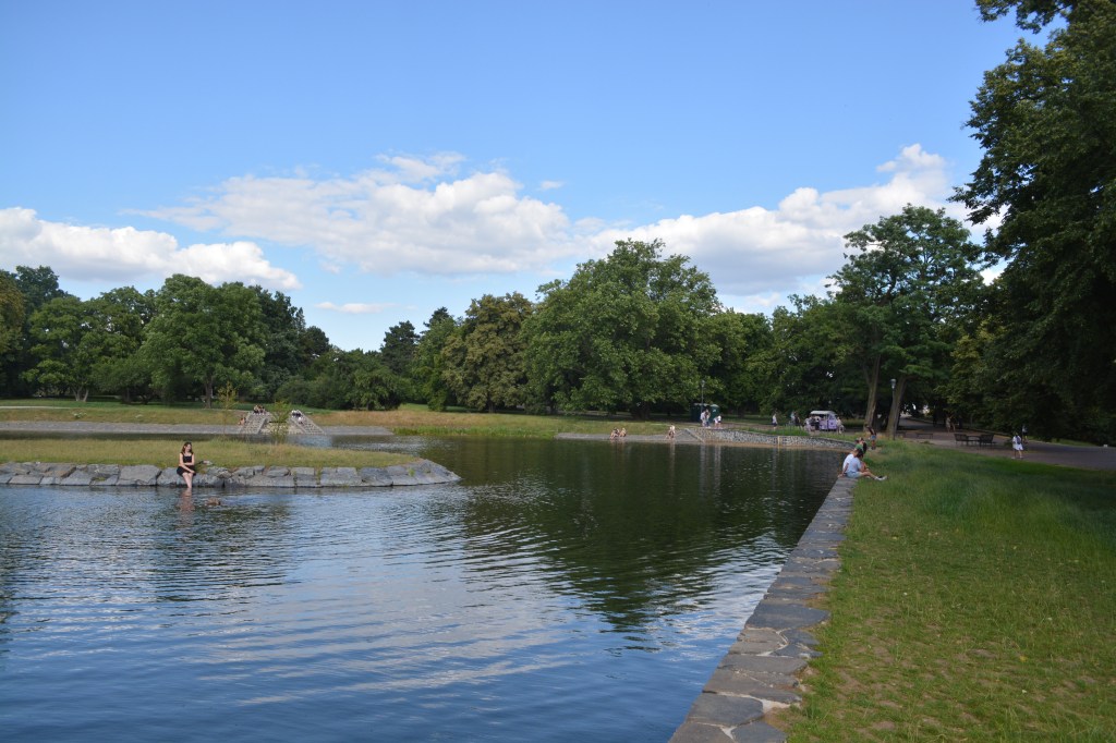Locals and tourists alike enjoy the view from the Prague Metronome I continued further towards the Letna Park’s western edge on my way to the tram when I saw a dog swimming in Letenské jezírko. Optimistically known officially as “Letenské Lake,” it’s really a small pond, man-made at that, and manicured to perfection to serve as a mildly majestic gateway to the park for those traveling by way east from Prague Castle. Quite beautiful, but no lake. Part of me wanted to hope in the water and swim with dog, but I knew I would have plenty of chances for swimming in more suitable waters at a later date.