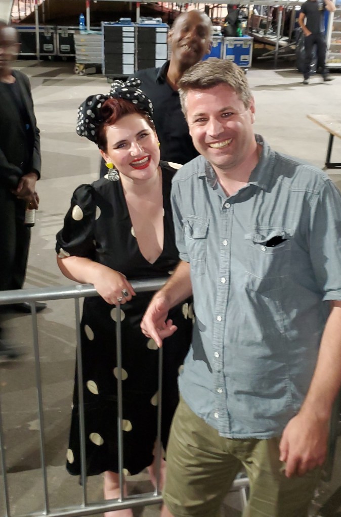 Music Director Dale Davis photobombs the author and Bronte after the show After the show, Bronte stayed to pose for photographs and talk to literally every single person who wanted to on they out. I thanked her for doing such a great job at keeping Amy’s legacy alive. As I did so, Amy’s musical director must have overhead me and gave a smile for the camera as he walked on by.
