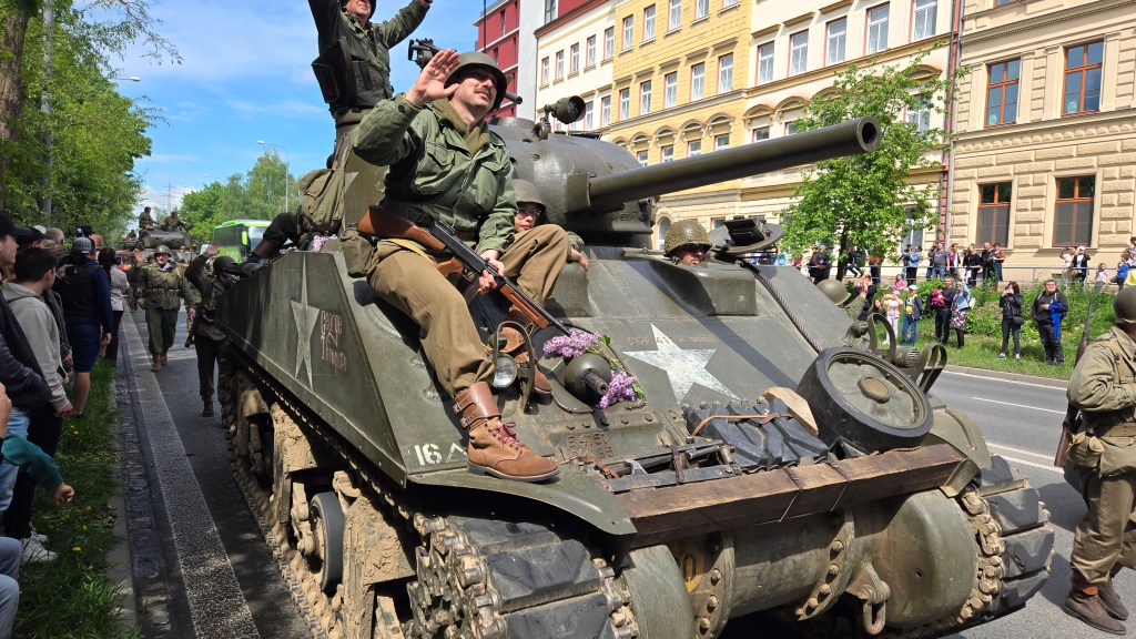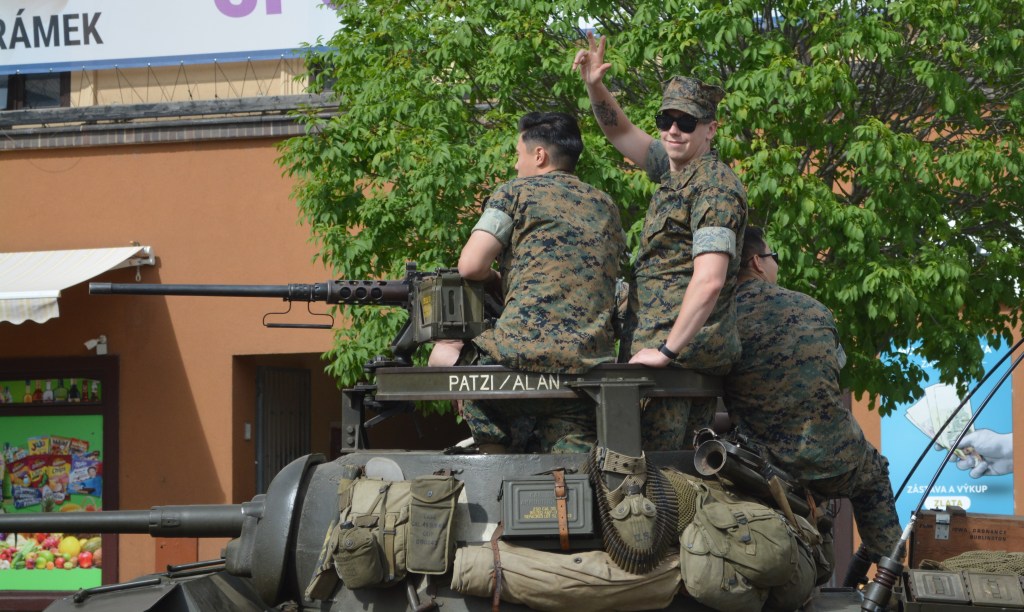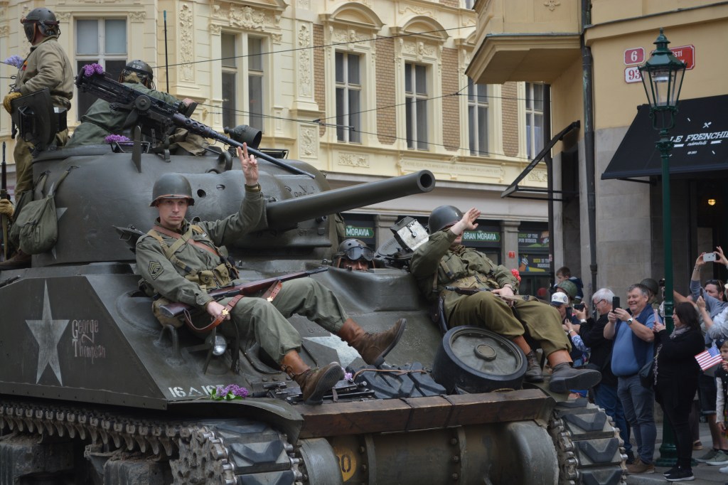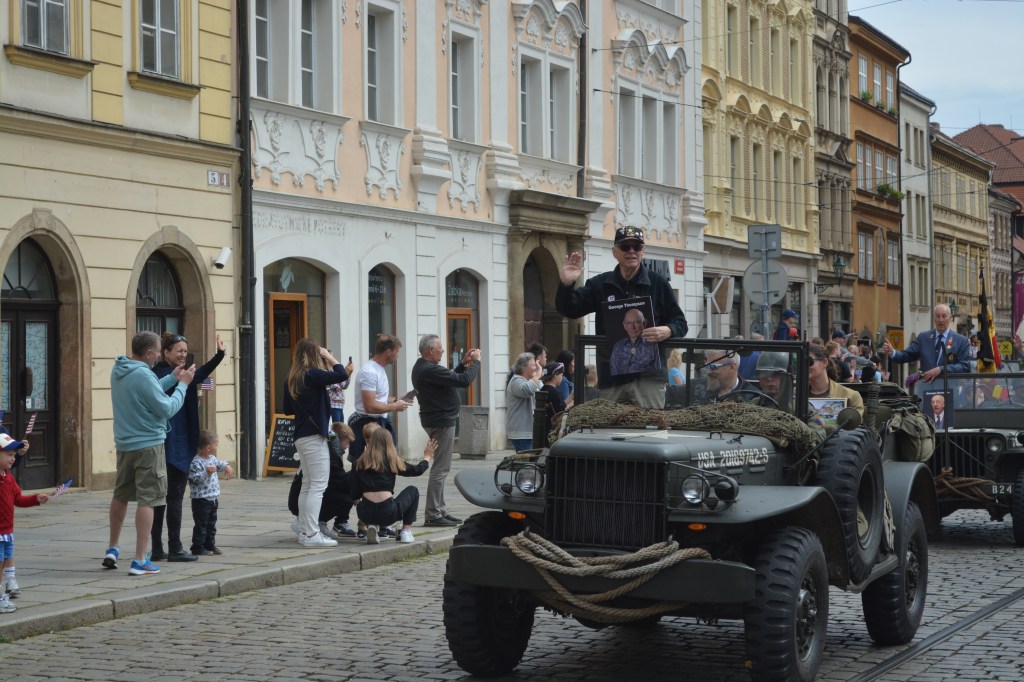 An authentic WWII US Army tank leads the way through PIlsen’s Republic Square, to the delight of joyous onlookers
