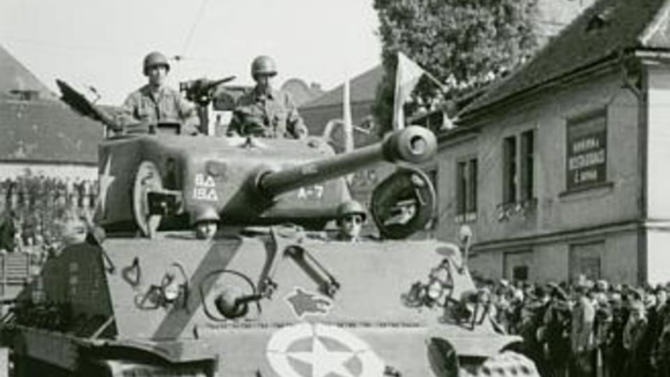 Soldiers from General Patton’s 5th US Army Brigade greet the crowd on their liberation ride through Pilsen, 6 May 1945