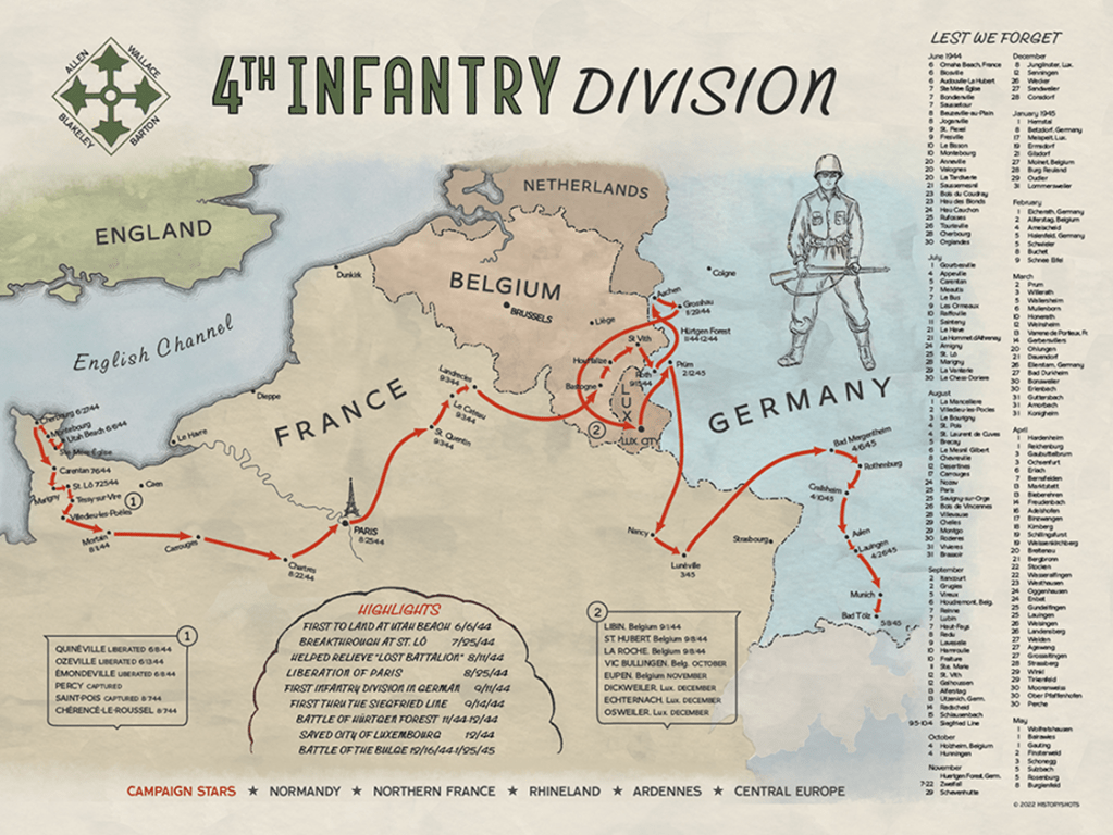 Still, I wondered, where was he two days later? Did he and his men keep marching on to Plzeň? The photo I found in the family archives put that question to rest. General Patton commanded the US 5th Army, and it was men under his command that officially liberated Plzeň. Sargent Donohue was in the 4th Army, commanded by General Raymond “Tubby” Barton, which landed on Utah Beech on June 6th and liberated Paris August 25th. In the final days of the war, they were in southern Bavaria. The troop movements of the US 4th Army during WWII align with my grandfather’s story exactly.